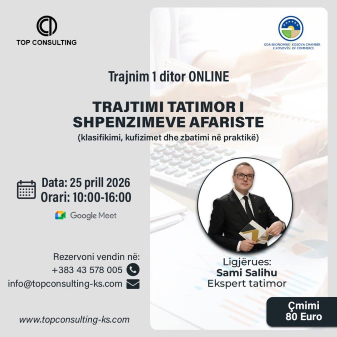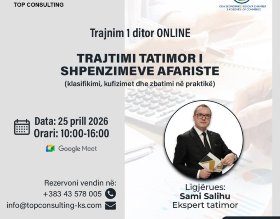 Top Consulting, në bashkëpunim me Odën Ekonomike të Kosovës, organizon trajnim profesional online me temë: “Trajtimi tatimor i shpenzimeve afariste”(Klasifikimi, kufizimet dhe zbatimi në praktikë) 🗓 […]
