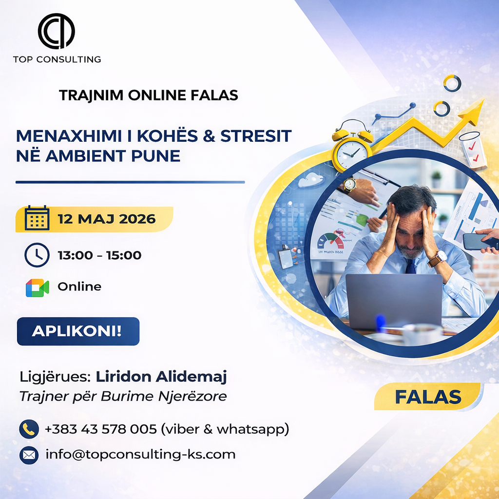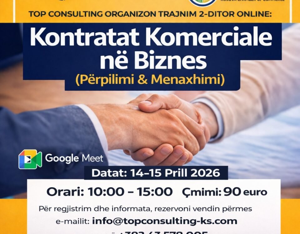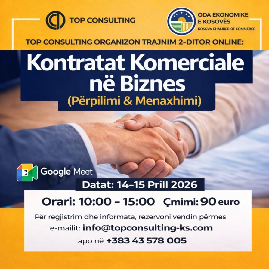 Top Consulting, në bashkëpunim me Odën Ekonomike të Kosovës, organizon trajnimin: 📢 𝐊𝐎𝐍𝐓𝐑𝐀𝐓𝐀𝐓 𝐊𝐎𝐌𝐄𝐑𝐂𝐈𝐀𝐋𝐄 𝐍Ë 𝐁𝐈𝐙𝐍𝐄𝐒(Përpilimi & Menaxhimi) 📅 Datat: 14–15 Prill 2026⏰ Orari: 10:00 – […]